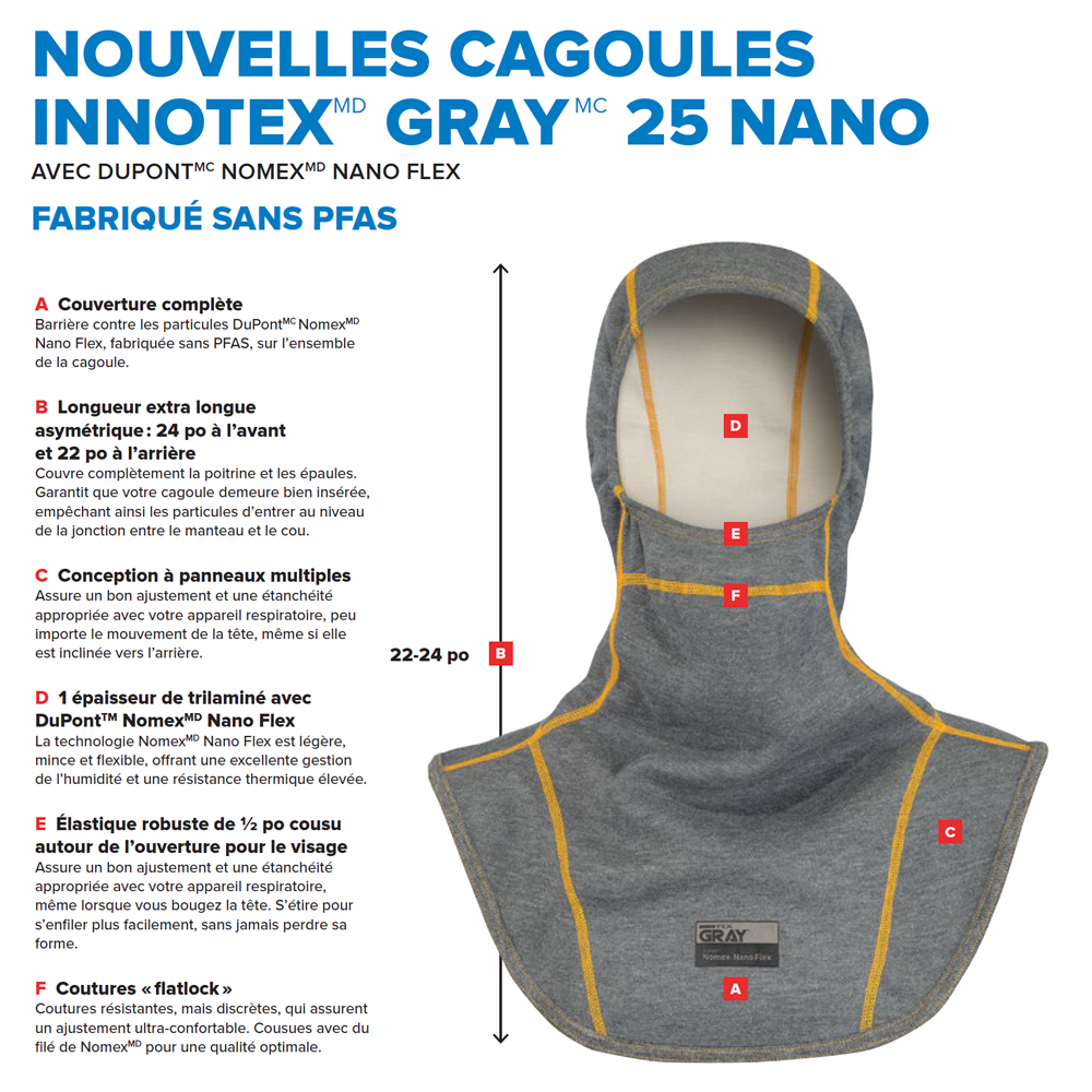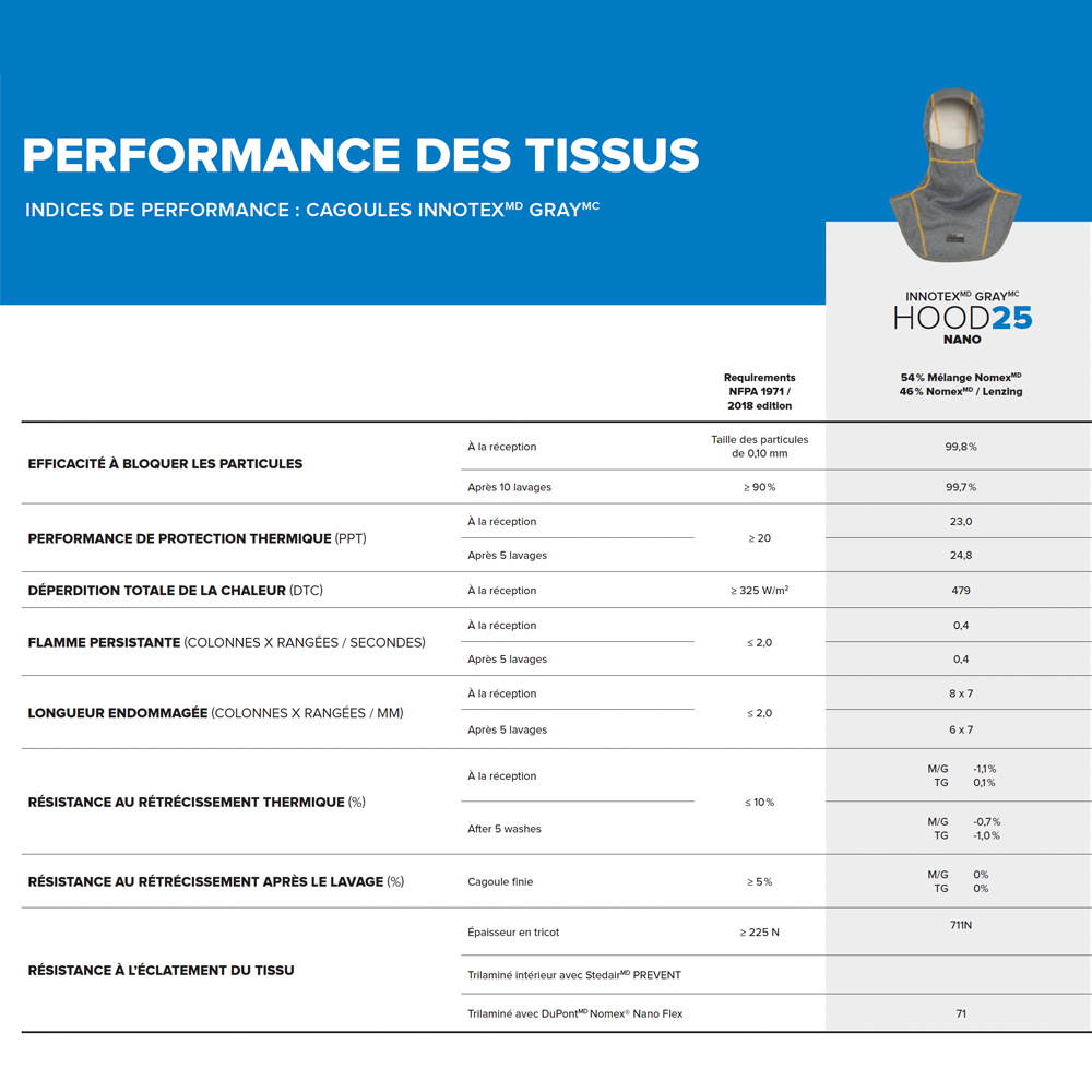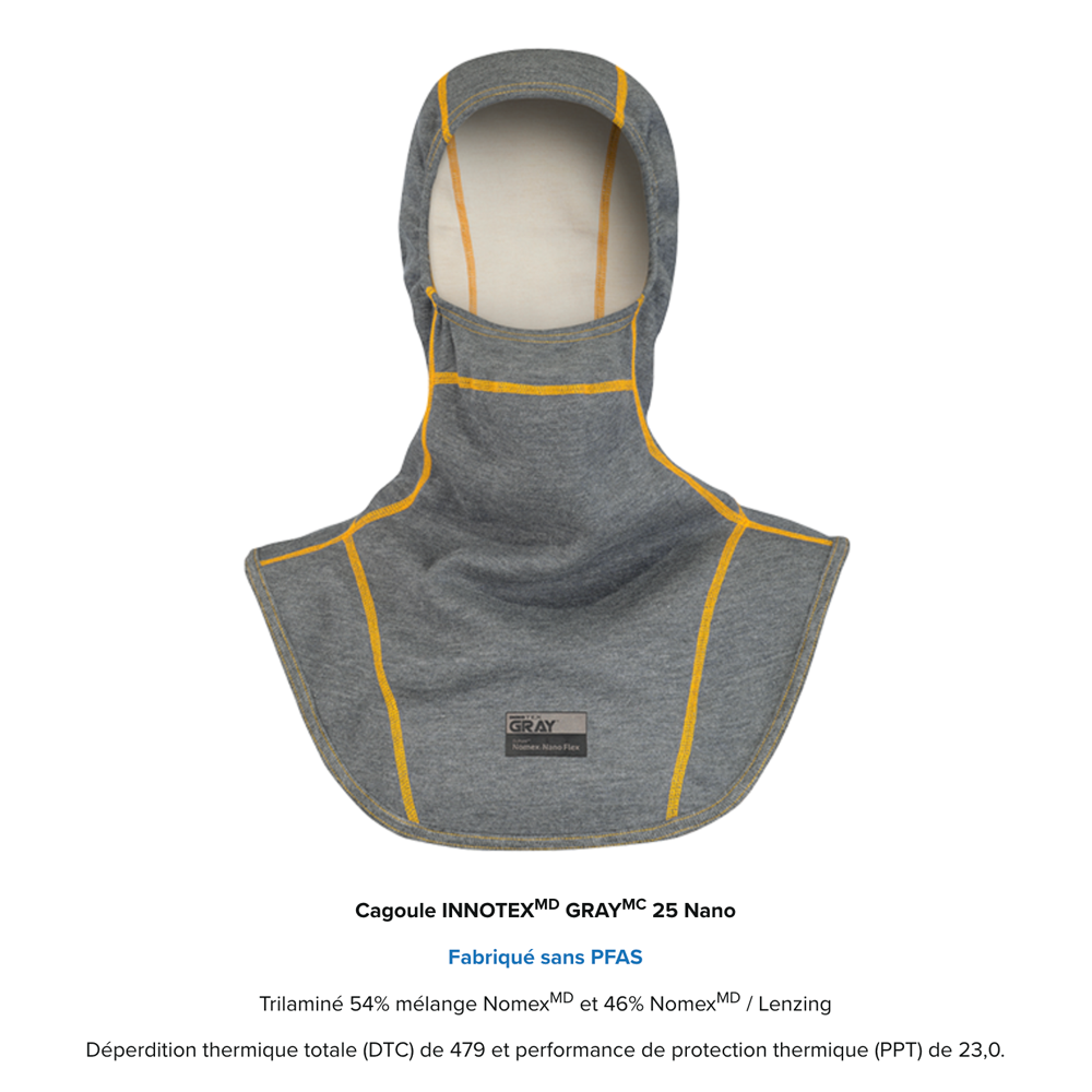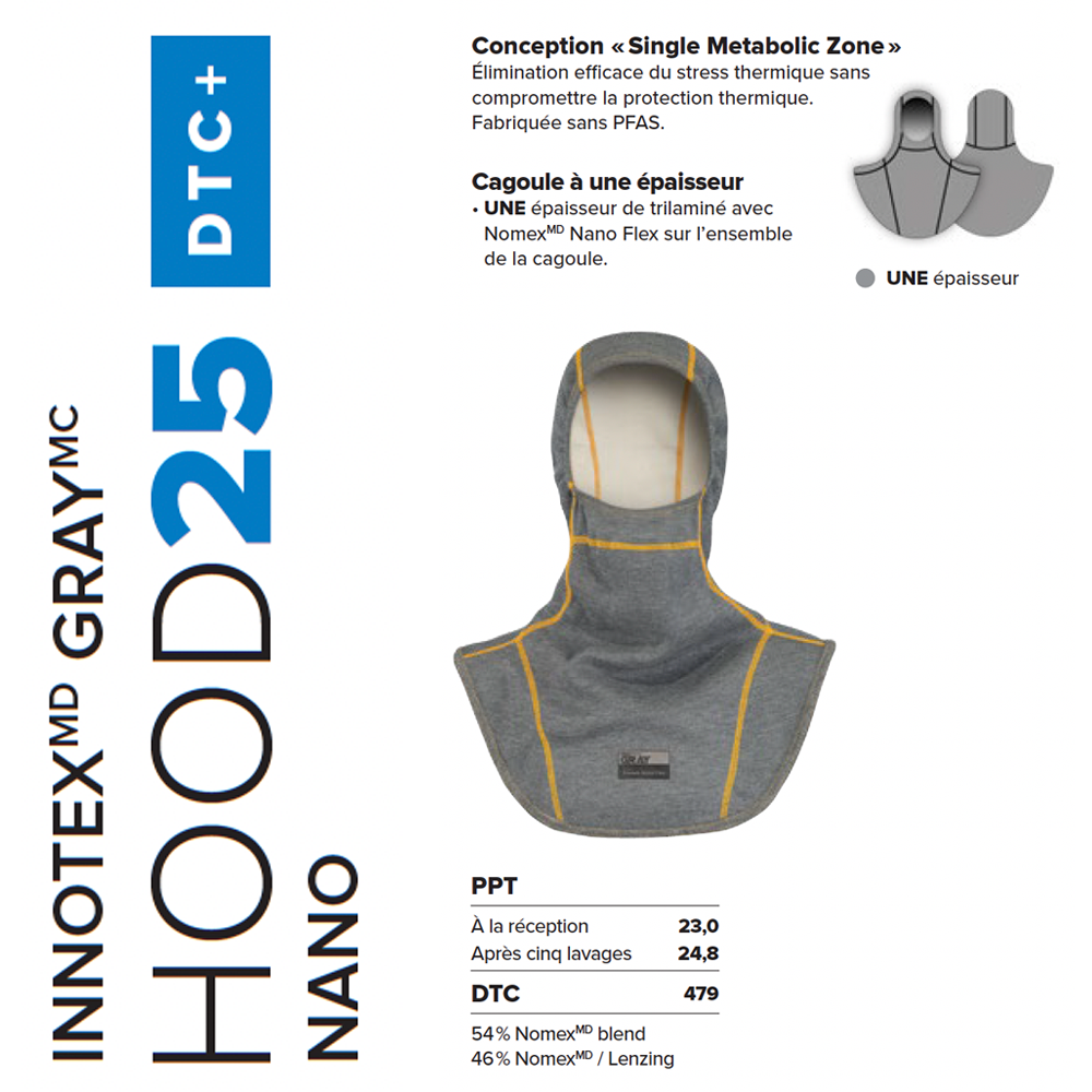 La cagoule à blocage de particules GRAY 25 NANO est une conception « Single Metabolic Zone ». Composée d'une épaisseur, la GRAY 25 NANO offre une élimination efficace du stress thermique sans compromettre la protection thermique. Fabriquée sans PFAS. La nouvelle cagoule GRAY 25 Nano, fabriquée sans PFAS, offre une protection complète contre les particules toxiques. Conçu avec du Nomex™ Nano Flex, ce trilaminé léger et flexible est doté d’une barrière contre les particules à base de fibres Nano, bloquant les particules à plus de 99,8 %. Sa respirabilité remarquable et son DTC élevé garantissent un confort imbattable dans toute situation.