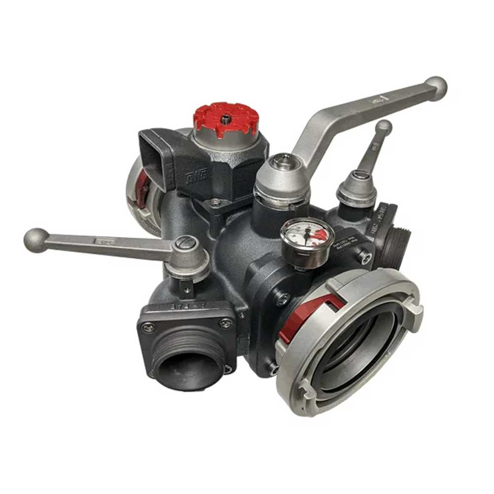 Cette division à 3 voies permettant d’alimenter deux lignes plus petites à partir d’une seule ligne LDH, tout en offrant une sortie LDH en ligne droite. Les sphères internes sont anodisées dur et équipées de tappets en acier inoxydable pour une résistance optimale à la corrosion. Le collecteur est doté d’une valve de décharge de pression ajustable ainsi que d’un manomètre rempli de liquide.